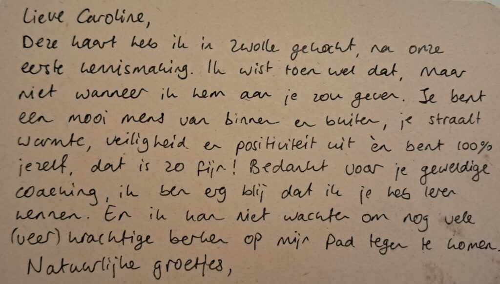 Daardoor vielen er heel wat kwartjes en ontstond er als het ware een rode draad waar ik me aan kon vasthouden. Die werd nog duidelijker door de mailtjes na elke wandeling, met hierin op mij afgestemde reflectievragen en tips.
